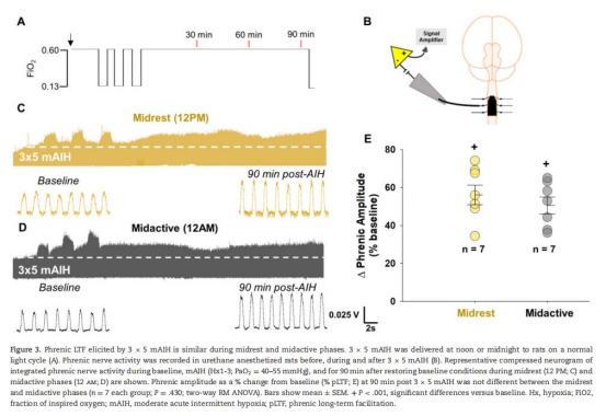 驗證晝夜節律對pLTF的影響:探究休息期(晝間)與活躍期(夜間)對AIH誘導的pLTF幅度及機制的影響。
