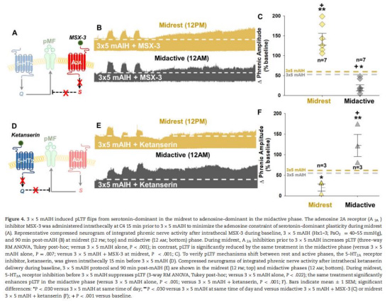 3×5 mAIH在休息期誘導56.1% pLTF(血清素主導),活躍期為50.5%(腺苷主導),幅度無差異但機制翻轉。