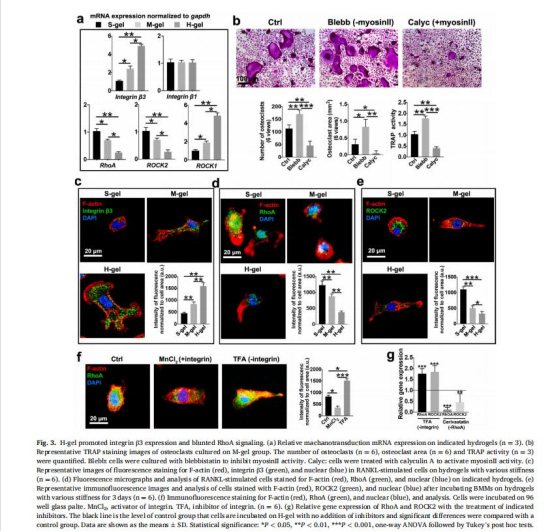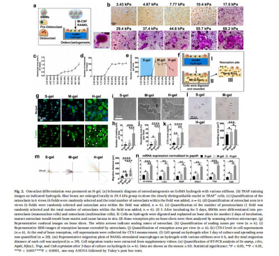 數據:高剛度組(68.2 kPa)的TRAP?多核破骨細胞數量較軟剛度組(2.43 kPa)增加3倍,骨吸收面積增加2.5倍(圖2j)。