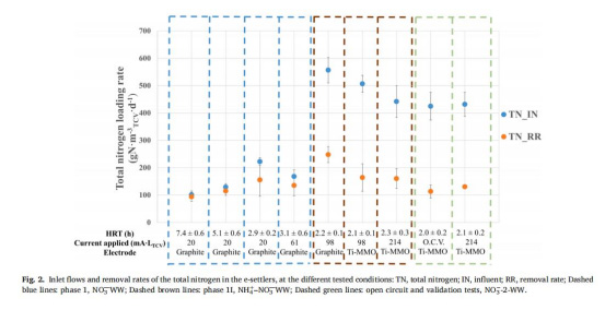 研究意義:量化e-settler在不同條件下的脫氮效能(最高248 ± 29 g N·m?3·d?1),證明電流刺激能顯著提升反硝化過程,減少氮污染排放,符合環(huán)境排放標準(如歐盟Directive 91/271/EEC的15 mg N·L?1限值)。