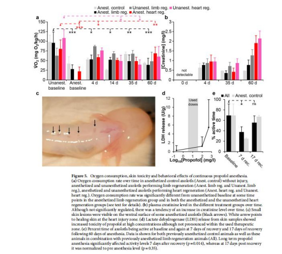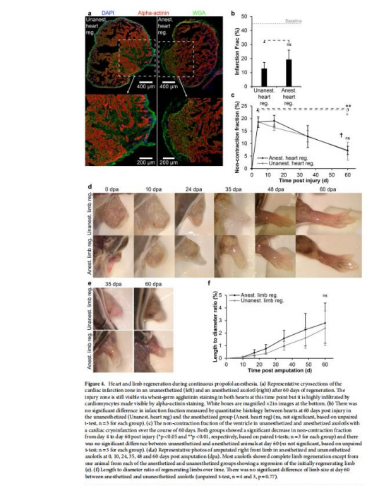 麻醉組與清醒對照組的肢體截肢再生成功率相當(麻醉組3/4完全再生,對照組2/3完全再生),心臟冷凍損傷后收縮功能恢復無差異;