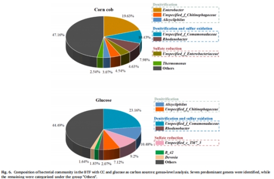 碳源對比:CC0.03與葡萄糖的NOx/SO?去除效率相當,但CC系統更易積累NH??和SO?2?,葡萄糖系統S?產量更高(圖5),源于碳源性質驅動的菌群分化(圖6)。