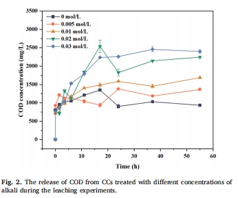 數據:不同堿濃度處理的CC在55小時內的COD累積釋放量(CC0.03最高:2397.94 mg/L)。