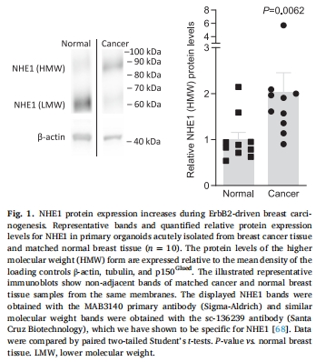 數(shù)據(jù):ErbB2乳腺癌組織中成熟NHE1(糖基化形式)表達(dá)顯著高于正常組織。