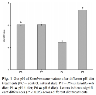 腸道pH可塑性:飲食pH可雙向調(diào)控紅脂大小蠹腸道酸堿度(酸性強(qiáng)化或中和)。