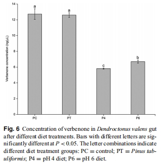 本研究通過人工飼料調(diào)控紅脂大小蠹腸道pH環(huán)境,探究其對腸道微生物群落及聚集信息素馬鞭草酮(verbenone)生產(chǎn)的影響。核心發(fā)現(xiàn)包括:
