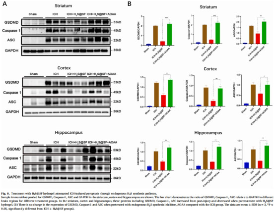 結果:AOAA(H?S合成抑制劑)完全阻斷H?S@SF的焦亡抑制效應(GSDMD表達恢復至ICH水平)。