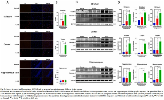 減少皮層、紋狀體、海馬區焦亡細胞(PI/DAPI雙染,圖5A)。