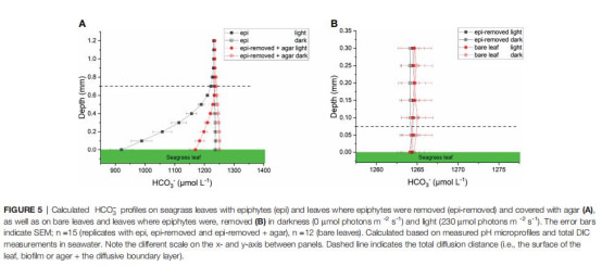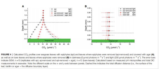 pH微剖面數(shù)據(jù)計(jì)算CO?/HCO??濃度(圖4、5),證實(shí)活性生物膜使葉面CO?近乎耗盡(0.1 μmol L?1),解釋海草為何依賴高能耗的HCO??利用。