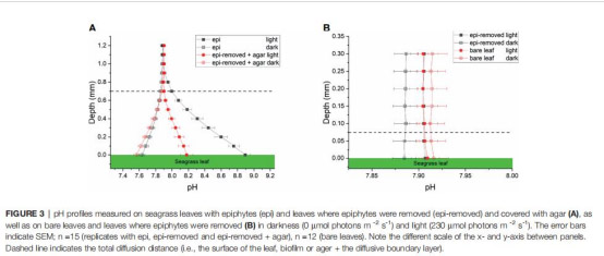2. 闡明碳限制機(jī)制:揭示生物膜如何通過改變pH和無機(jī)碳形態(tài)(CO? vs. HCO??)影響海草光合效率。