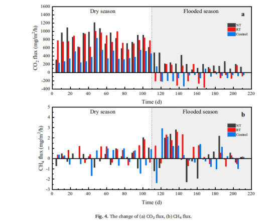 淹水季RT組CO?通量(-53.71 mg/m2/h)轉(zhuǎn)為負(fù)值。意義:證實(shí)收割植被可使系統(tǒng)從碳源轉(zhuǎn)為碳匯。