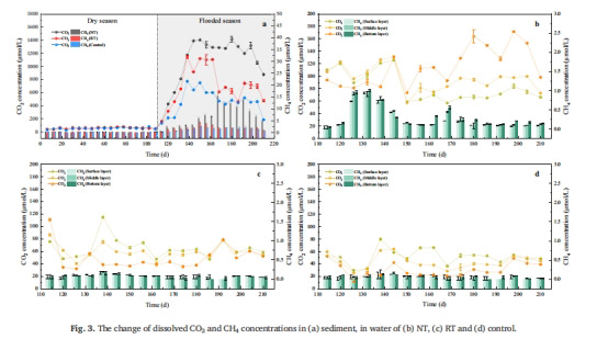 淹水季NT組沉積物溶解CH?(7.12 μmol/L)顯著高于RT組(2.13 μmol/L)。意義:植被殘?bào)w分解驅(qū)動(dòng)厭氧環(huán)境促進(jìn)CH?生成。