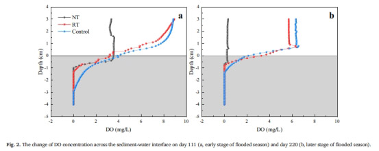 RT組較淺的DO滲透深度解釋其低CH?排放(0.64 mg/m2/h vs NT組1.45 mg/m2/h)。