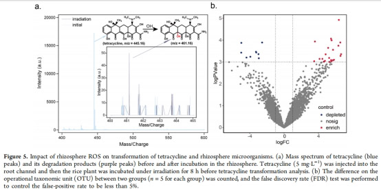 污染物降解(圖5a):ROS導致四環(huán)素羥基化產物生成(質譜鑒定)。意義:為根際污染物原位降解提供新機制。
