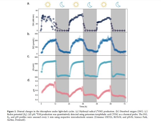 1.根際是ROS新熱點:水稻根際存在顯著胞外ROS生成(·OH達10??M),濃度與水生光化學途徑相當,且具晝夜波動性(晝高夜低)。