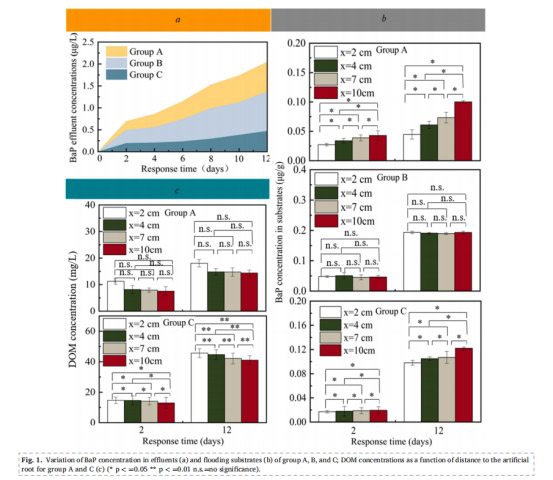 數(shù)據(jù)意義:圖1a顯示C組(根分泌物+微生物)的BaP去除率最高(285.93 ng/m2/day),表明協(xié)同作用增強(qiáng)凈化能力;圖1b顯示根分泌物輸入?yún)^(qū)(2cm)BaP積累降低(C組98.10 ng/g vs. B組193.41 ng/g),證明根分泌物提升底物凈化效率。數(shù)據(jù)量化了根分泌物對BaP源匯平衡的調(diào)控,為濕地設(shè)計優(yōu)化(如植物選擇)提供依據(jù)。
