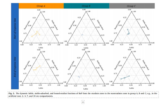 數(shù)據(jù)意義:圖2顯示根分泌物輸入?yún)^(qū)(C組,2cm)易釋放BaP比例增至32%(vs. B組27%),結(jié)合殘留比例降至46%(vs. B組56%)。說明根分泌物促進(jìn)BaP從結(jié)合殘留向易釋放轉(zhuǎn)化,提升其生物可利用性,這對評估濕地長期污染風(fēng)險(如BaP再釋放潛力)具有直接意義。
