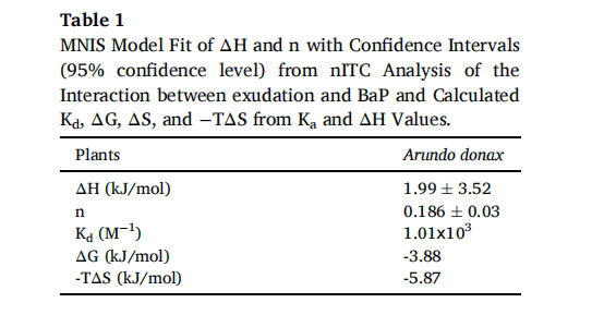 數(shù)據(jù)意義:表1顯示根分泌物與BaP結(jié)合常數(shù)(Kd=1.01×103 M?1)和負(fù)吉布斯自由能(ΔG=-3.88 kJ/mol),表明自發(fā)結(jié)合過程。這解釋了根分泌物通過降低界面張力增強(qiáng)BaP生物可利用性的機(jī)制,為啟動效應(yīng)的非生物途徑提供量化證據(jù)。