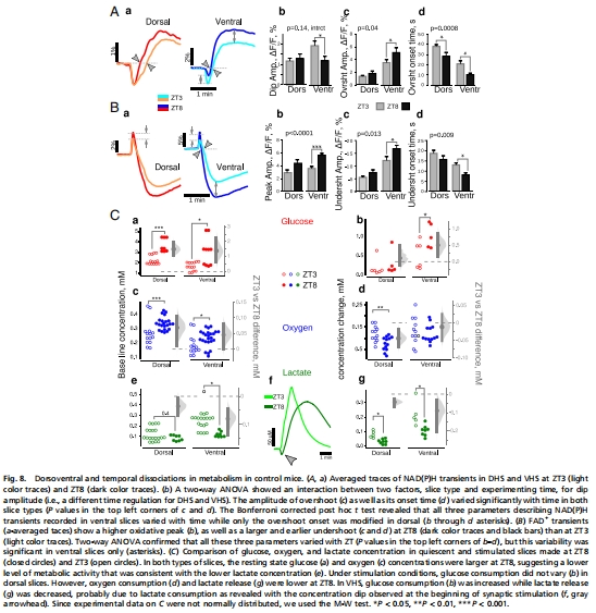 健康VH:ZT8時(shí)氧化代謝增強(qiáng)(FAD??峰值↑),糖酵解減弱(乳酸釋放↓)。
