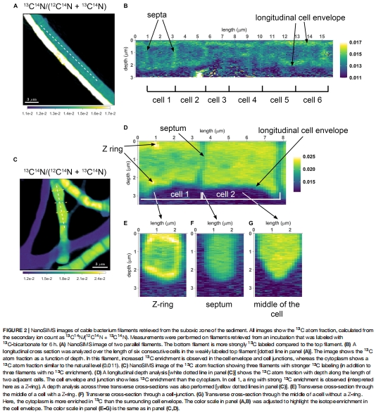本研究通過結合雙標記穩定同位素探測(13C和1?N)、納米二次離子質譜(nanoSIMS)、熒光顯微鏡和基因組分析,揭示了電纜細菌(cable bacteria)獨特的細胞周期與生長機制: