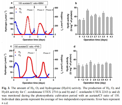 乙酸鹽/Cl?=150時,兩藻種持續產氫15天(均值82–106 μmol/L),生物量穩定(0.54–0.76 g/L)(圖5a,d)。