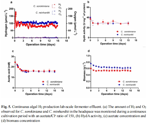 產氫性能:在富含乙酸鹽的發酵廢水中,C. sorokiniana和C. reinhardtii分別實現15天持續產氫~80 μmol/L和~95 μmol/L(圖5)。