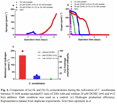 DCMU或黑暗條件下無H?產生(圖4a-b),O?耗盡也不觸發產氫。