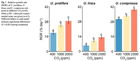 數(shù)據(jù):所有物種的RGR隨CO?升高顯著增加(U. compressa在2000 ppm時(shí)RGR達(dá)39.32%·d?1)。