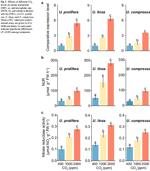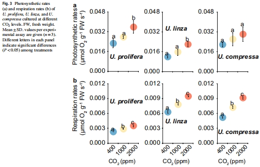 本研究通過(guò)實(shí)驗(yàn)室培養(yǎng)實(shí)驗(yàn),探究了大氣CO?濃度升高(400 ppm vs. 1000 ppm vs. 2000 ppm)對(duì)三種石莼屬海藻(Ulva prolifera、U. linza、U. compressa)的生理影響: