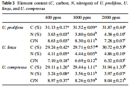 數(shù)據(jù):組織氮含量顯著增加(如U. prolifera從3.63%升至4.38%),C/N比下降(如U. linza從7.10降至6.32)。