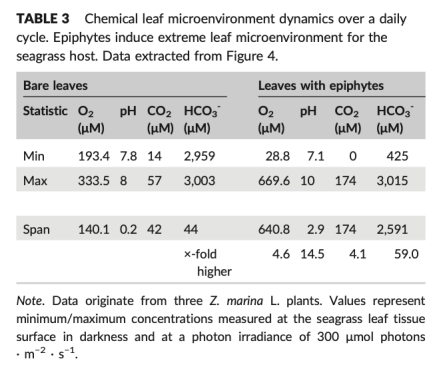 5. 在黑暗中,附生生物膜及其呼吸作用導致葉片表面缺氧和CO2積累,減少了O2向葉片內部的擴散,損害了海草的夜間內部組織通氣。