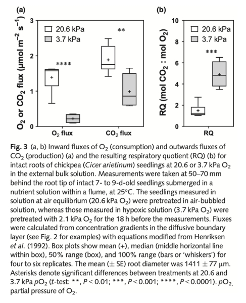 3. 呼吸商(RQ)隨O?降低而升高:當外部O?從20.6 kPa降至3.7 kPa時,根系RQ從1.5升至4.9(圖3b),表明呼吸作用向乙醇發酵轉變。