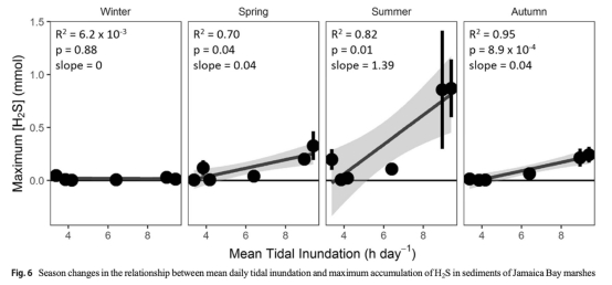 ? 意義:解釋空間差異,淹沒時長>8.9小時的站點H?S積累顯著增強(圖6),尤其夏季每增加1小時淹沒,H?S增加139 μM