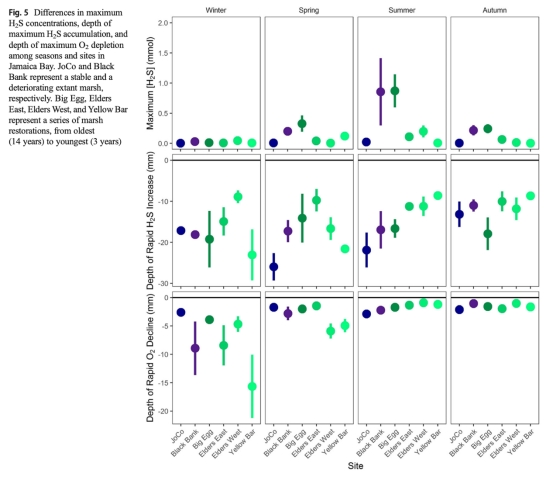 摘要指出濕地恢復的生態機制鮮少被評估。在富營養化河口中,沉積物硫化氫積累可能加速鹽沼退化,其驅動機制涉及濕地植物生長與微生物氧化還原反應的復雜反饋。研究利用紐約牙買加灣城市富營養化河口的恢復鹽沼時間序列,結合穩定現存沼澤與退化沼澤的對比,通過沉積物氧和硫化物微剖面分析,發現夏季沉積物氧濃度最低、硫化物濃度最高。硫化物積累與潮汐淹沒時長呈正相關(如退化沼澤Black Bank淹沒9.4小時/天),而植物根系生物量增加可促進氧擴散至深層沉積物,降低硫化物毒性,增強鹽沼對海平面上升的韌性。