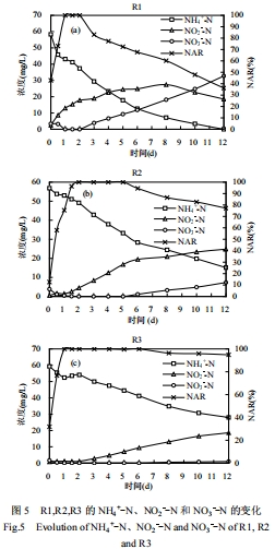 數據:R1的NAR較低(NO3--N生成多),R2和R3的NAR均達90%左右,且幾乎無NO3--N產生。大粒徑AGS(R3)的NH4+-N去除率略低于小粒徑。