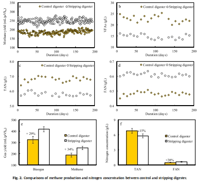 數據:剝離消化器甲烷產量比對照組高34%,TAN濃度降低20%(從6.8 g/L降至5.8 g/L)。