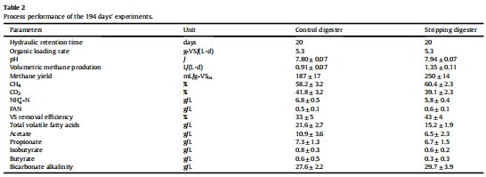 實驗設計:設置兩個平行中溫厭氧消化器(有效容積12 L),處理高固體雞糞(TS=15%)。一個消化器配備原位氨氣剝離系統(剝離消化器),另一個為對照組(無剝離)。兩者在相同水力停留時間(HRT=20天)和有機負荷率(OLR=5.3 g-VS/(L·d))下運行194天。