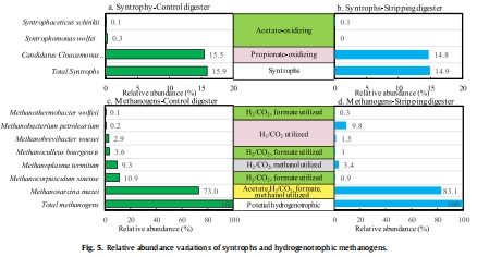 數據:細菌群落以Firmicutes、Bacteroidetes、Cloacimonetes為主(TAN范圍5.8-6.8 g/L)。古菌群落中Methanosarcina sp.相對豐度在剝離消化器增加10%,氫營養型產甲烷菌豐度降低(從27%降至17%)。