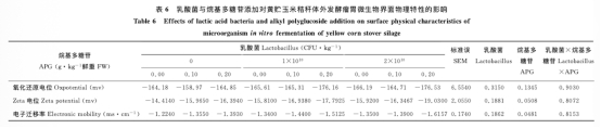 論文摘要指出,研究旨在探討乳酸菌和烷基多糖苷對(duì)玉米秸稈黃貯品質(zhì)和體外發(fā)酵特性的影響。采用3x3雙因子實(shí)驗(yàn)設(shè)計(jì),乳酸菌設(shè)三個(gè)水平(0、1x10^10、2x10^10 CFU/kg),烷基多糖苷設(shè)三個(gè)水平(0、0.10、0.20 g/kg)。結(jié)果表明,乳酸菌添加增加乳酸含量、比表面積、外觀總分、酸性洗滌纖維和干物質(zhì)含量,降低氨氮/總氮;體外發(fā)酵中潛在最大產(chǎn)氣量和總揮發(fā)性脂肪酸增加,產(chǎn)氣速率降低。烷基多糖苷提高外觀總分、酸性洗滌纖維、干物質(zhì)含量、Zeta電位、電子遷移率和干物質(zhì)消失率。乳酸菌與烷基多糖苷交互影響粗蛋白質(zhì)、pH值、乙酸、異丁酸等。最佳添加量為乳酸菌2x10^10 CFU/kg和烷基多糖苷0.20 g/kg,能保證黃貯品質(zhì)并提高降解特性。