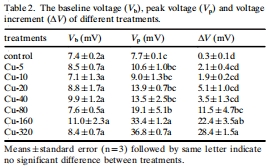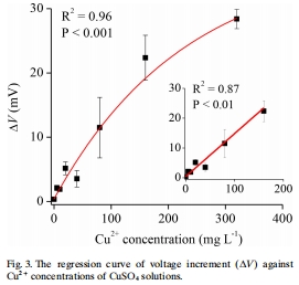 數(shù)據(jù):Cu2?加入后電壓30秒內(nèi)達(dá)峰值,增量(ΔV)隨濃度升高而增大(Cu-320處理ΔV=28.4 mV)。ΔV與Cu2?濃度(≤160 mg/L)呈線性關(guān)系(R2=0.96)(圖3)。
