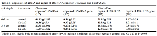 數(shù)據(jù):320 mg/L Cu2?抑制表層土壤中地桿菌(16S rRNA下降45%)和梭菌(活性下降34%)的豐度與活性,但深層土壤無顯著影響。