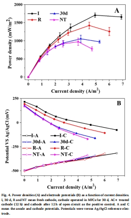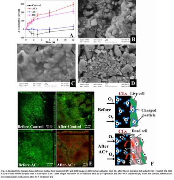 AC+電場高效再生陰極:AC+處理顯著恢復電流密度(43-50%)和功率密度(37%),優于DC處理,且能耗低至1/4,適用于實際MFCs。