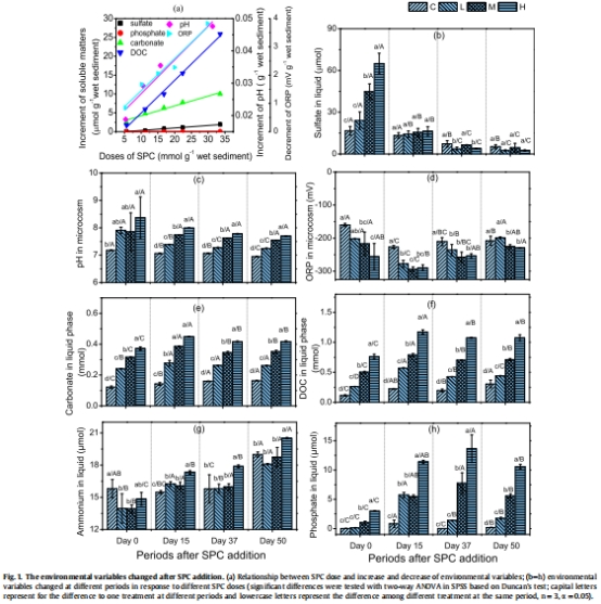 數據:Fig. 1a顯示SPC劑量與溶解物質增加(硫酸鹽、碳酸鹽、DOC)和ORP降低呈線性關系;Fig. 1b-h顯示時間序列上pH下降、ORP先降后升、碳酸鹽和DOC先增后減。