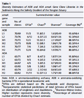數據:AOB和AOA的Shannon指數分別為0.07-2.11和0.20-2.69,AOB多樣性季節性變化顯著(P=0.045),AOA在高鹽度區域更豐富。
