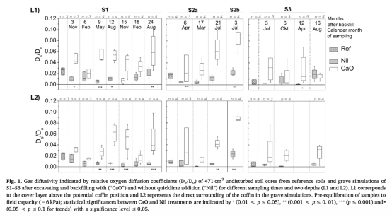 摘要描述了墓穴土壤因常見挖掘和回填實踐導致土壤結構破壞,影響氣體和水分傳輸功能,可能導致分解問題,如氧氣不足。研究測試了生石灰(CaO)應用作為結構改良方法,以改善墓穴土壤的通氣性。通過在德國三個不同質地地點(沙壤土、粉壤土、粘壤土)設置墓穴模擬(無尸體),比較添加生石灰和不添加的處理,測量擴散性和孔隙功能參數,并進行現場監測。結果表明,生石灰應用提高了擴散性和氧氣濃度,但效果受粘土含量和土壤水分影響。