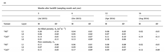 2 孔隙特性:包括空氣填充孔隙度(θa)、孔隙連續性指數(C1)和曲折度(T),在標準基質勢(-6 kPa)下測量。數據來自Table 2。研究意義是揭示生石灰如何影響孔隙的連通性和結構穩定性,為理解土壤物理性質變化提供依據。