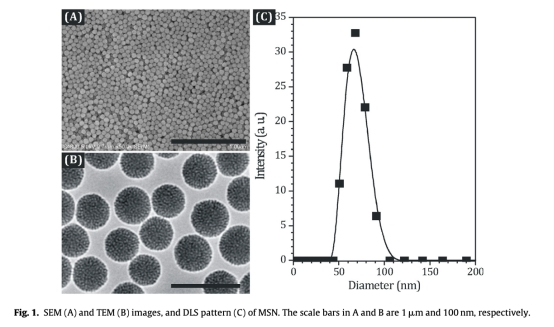 1. 從圖1的SEM和TEM圖像顯示MSN的形態(tài)和尺寸約50 nm,單分散性好,研究意義是MSN的尺寸和結(jié)構(gòu)有利于高效細(xì)胞攝取和藥物負(fù)載,為納米藥物設(shè)計提供基礎(chǔ)。