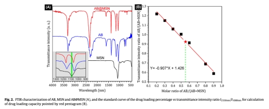 2. 從圖2的FTIR數(shù)據(jù)顯示AB成功負(fù)載到MSN中,負(fù)載能力為653 mg/g AB(相當(dāng)于130.6 mg/g H2),研究意義是證明AB@MSN具有超高H2負(fù)載能力,遠(yuǎn)超傳統(tǒng)方法,確保高效療法。