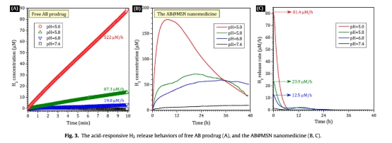 3. 從圖3的H2釋放曲線顯示在酸性PBS(pH=5.0, 5.8, 6.8)中H2釋放速率高,而在pH=7.4幾乎不釋放,研究意義是驗證AB@MSN的酸響應(yīng)性,能針對腫瘤酸性微環(huán)境釋放H2,減少對正常組織影響。