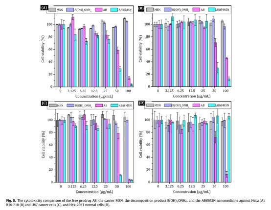 5. 從圖5的細(xì)胞毒性測試顯示AB@MSN對癌細(xì)胞(HeLa、B16-F10、U87)有顯著毒性,但對正常細(xì)胞(Hek-293T)毒性低,研究意義是證明AB@MSN的選擇性抗癌特性,提高治療安全性。